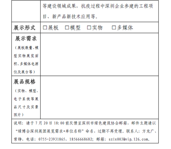 參展意向征集截止時間為2020年7月20日。請各單位在截止時間前,將《深圳展區(qū)企業(yè)參展意向收集表》(附件2)提交至市綠色建筑協(xié)會。經(jīng)篩選后確定參展企業(yè),并另行通知提交參展資料。我局將組織統(tǒng)一制作深圳展區(qū)參展展板及會刊。參展企業(yè)無需支付展位費(fèi)、展板制作費(fèi),器材租賃等其他費(fèi)用自理。