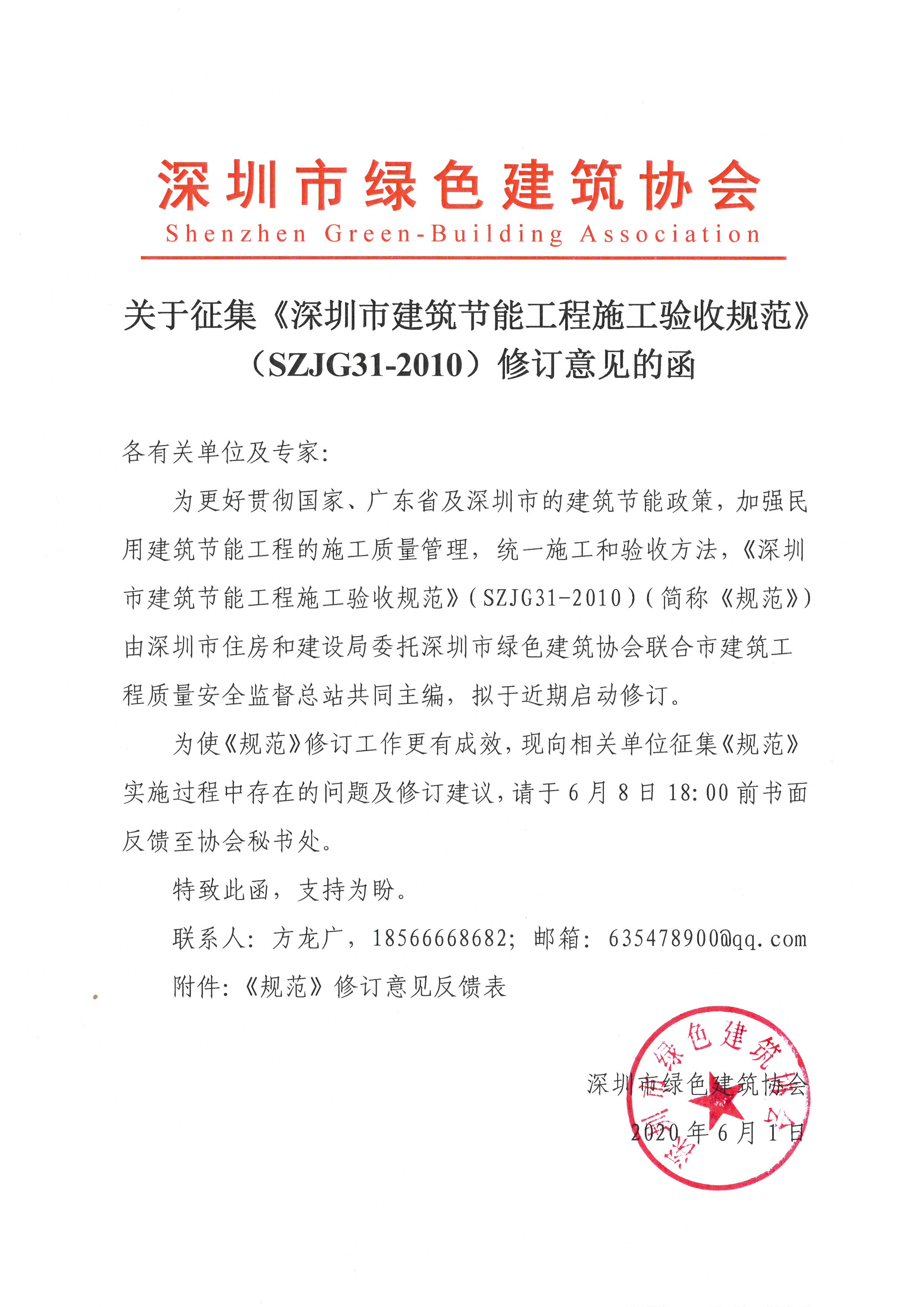 深圳市綠色建筑協(xié)會關(guān)于征集《深圳市建筑節(jié)能工程施工驗收規(guī)范》(SZJG31-2010)修訂意見的函
