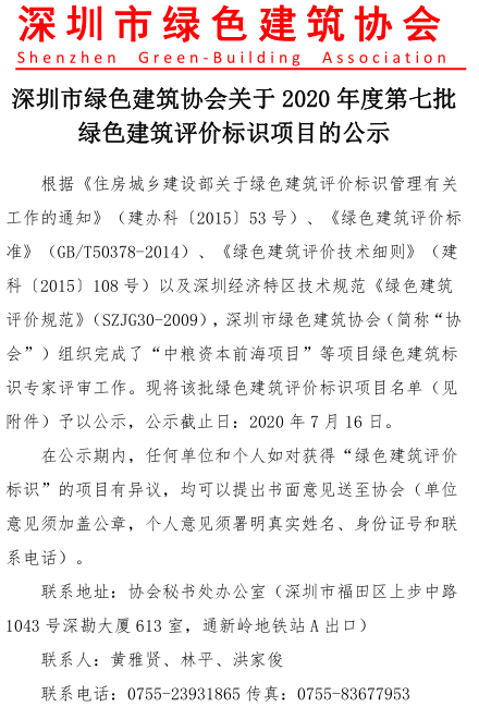 深圳市綠色建筑協(xié)會(huì)關(guān)于2020年度第七批綠色建筑評(píng)價(jià)標(biāo)識(shí)項(xiàng)目的公示