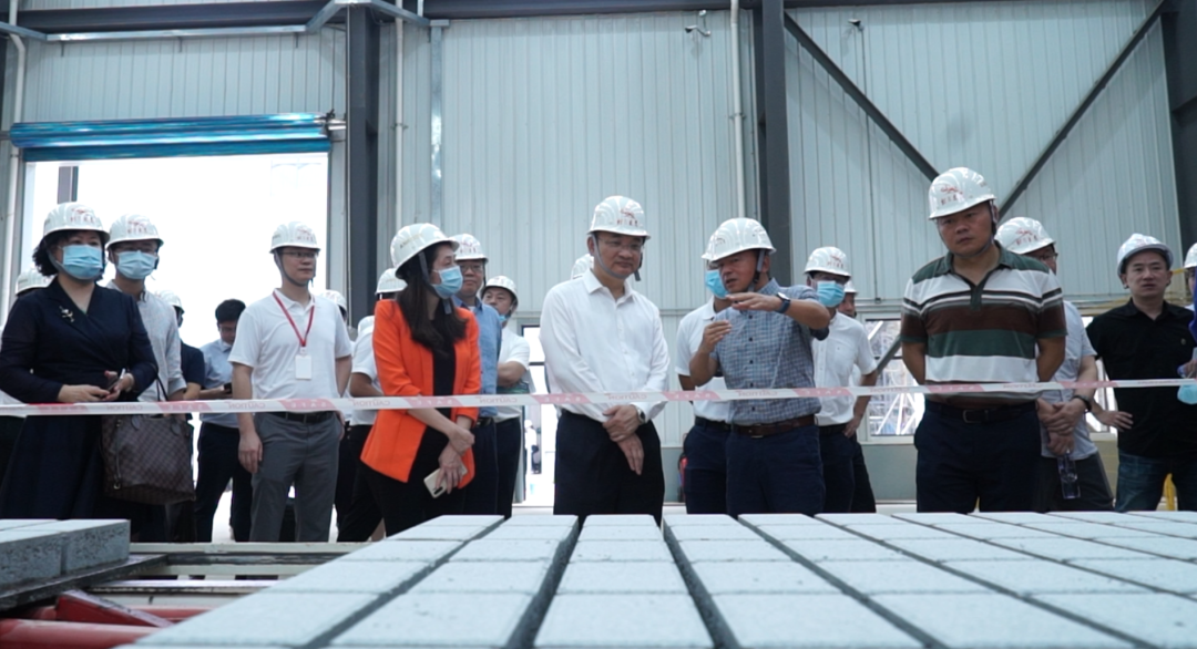 儀式結(jié)束后,領(lǐng)導(dǎo)及嘉賓參觀了大空港項目廠房及設(shè)備,并在再生砌塊生產(chǎn)車間見證了大空港項目第一批透水磚從原材料到成品僅需1分鐘就“誕生”的智能化生產(chǎn)過程。