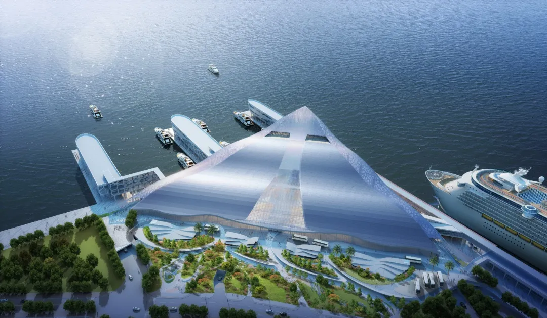 深圳蛇口郵輪中心由法國新未來主義建筑流派建筑大師德尼斯.嵐明(Denis Laming)設(shè)計,功能復(fù)雜多樣,為高層綜合性建筑,集水陸交通換乘、通關(guān)服務(wù)、辦公、商業(yè)、濱海休閑、配套服務(wù)于一體。項目總用地面積約4.26萬平方米,總建筑面積13.82萬平方米,其中地上計容建筑面積約7.8萬平方米,地下建筑面積6.02萬平方米,建筑高度64米,地上10層,地下2層+1夾層。主要功能分區(qū):地下一層為交通換乘層,地下二層為停車庫,夾層為行李分揀及提取層,一層為到港通關(guān)服務(wù)層,二層為離港通關(guān)服務(wù)層,三至四層為配套商業(yè),五至八層為配套辦公,九層為觀光平臺,十層為射燈設(shè)備平臺。