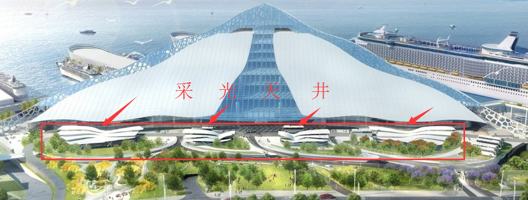 健康舒適也是新國標綠色建筑標準的新要求,作為大型的交通樞紐型公共建筑,郵輪中心采用了被動式綠色建筑措施,如大規(guī)模的玻璃采光屋頂,極大降低了照明能耗,提高了室內(nèi)空間的光照質(zhì)量。通過大空間自然通風,在過渡季減少空調(diào)負荷,保證了室內(nèi)空氣質(zhì)量良好。其他措施如環(huán)境煙控、優(yōu)良照明、無害材料裝修、地下室采光天井等,都能夠極大地保證項目的環(huán)境健康舒適。