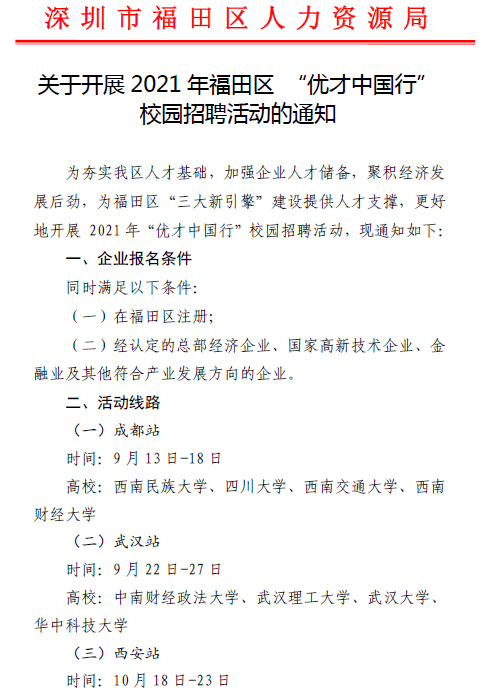 深圳市福田區(qū)人力資源局開展2021年福田區(qū) “優(yōu)才中國行” 校園招聘活動