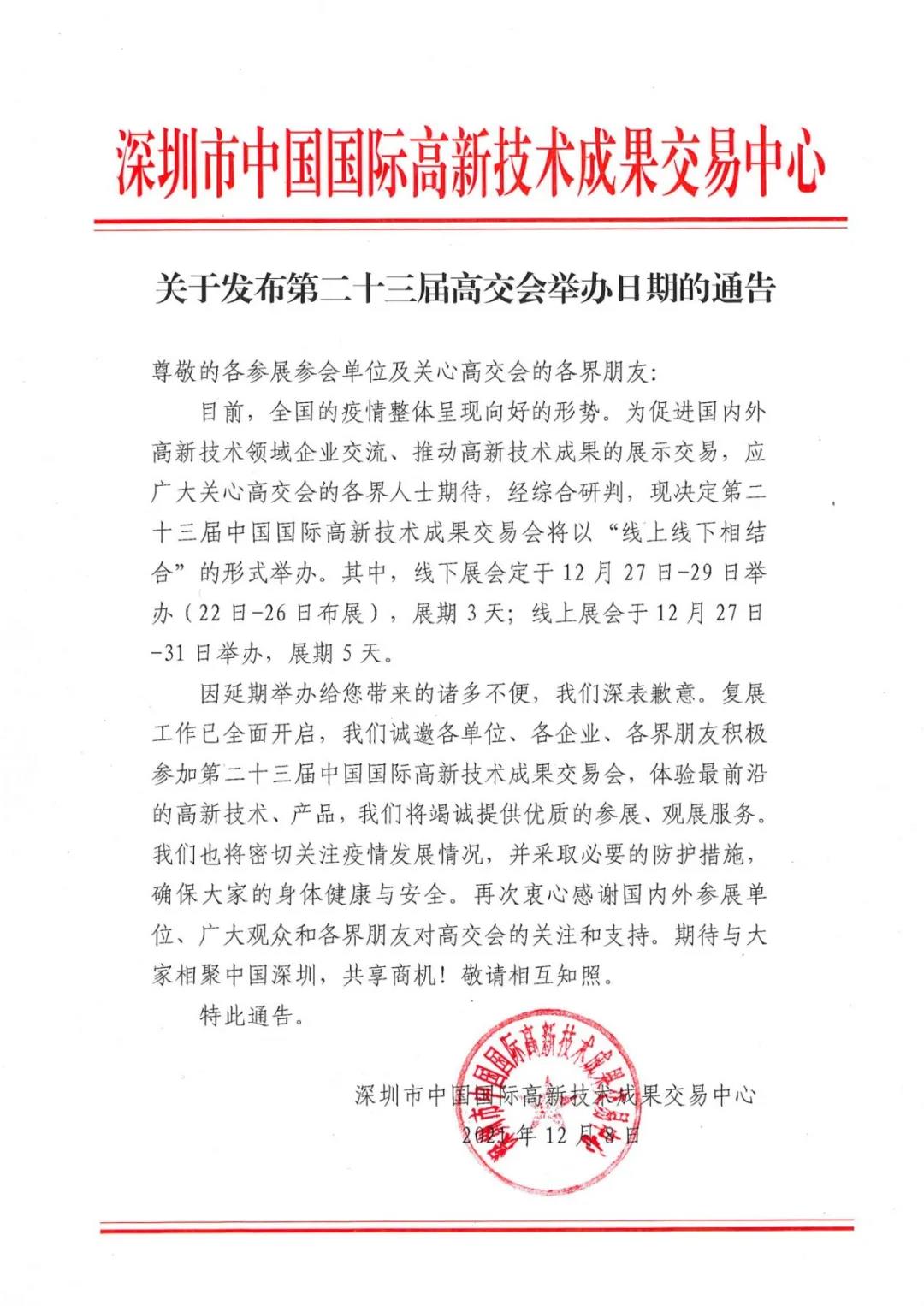 關(guān)于發(fā)布第二十三屆高交會舉辦日期的通告