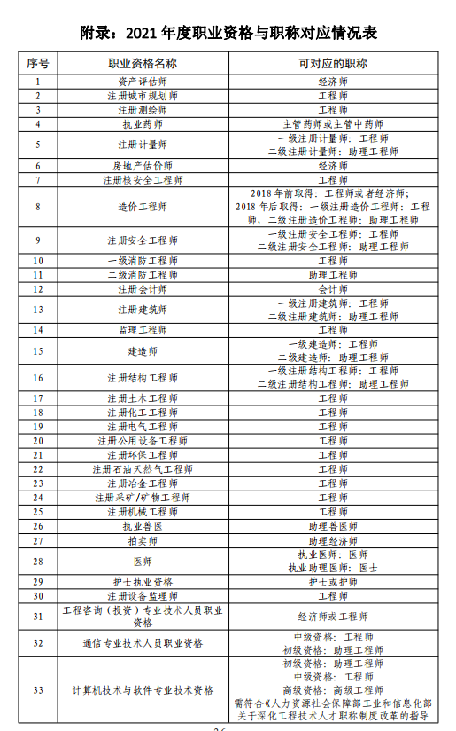 如一級建造師可對應(yīng)工程師;二級建造師可對應(yīng)助理工程師等等.....(具體請?jiān)斠?021 年度職業(yè)資格與職稱對應(yīng)情況表)