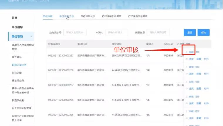 三、個人職稱申報人員將資料提交到單位審核,單位管理員可在“單位事項-職稱評審業(yè)務”查詢職稱申報人員材料