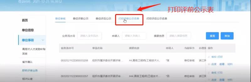 七、上傳單位承諾書及審核完成信息后,審核提交選擇業(yè)務:報送去向及報送單位。提交后,業(yè)務將繼續(xù)在單位進行評前公示環(huán)節(jié),打印評前公示表