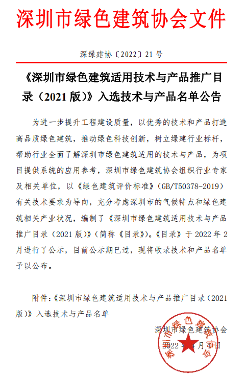 《深圳市綠色建筑適用技術(shù)與產(chǎn)品推廣目錄(2021版)》入選技術(shù)與產(chǎn)品名單公告