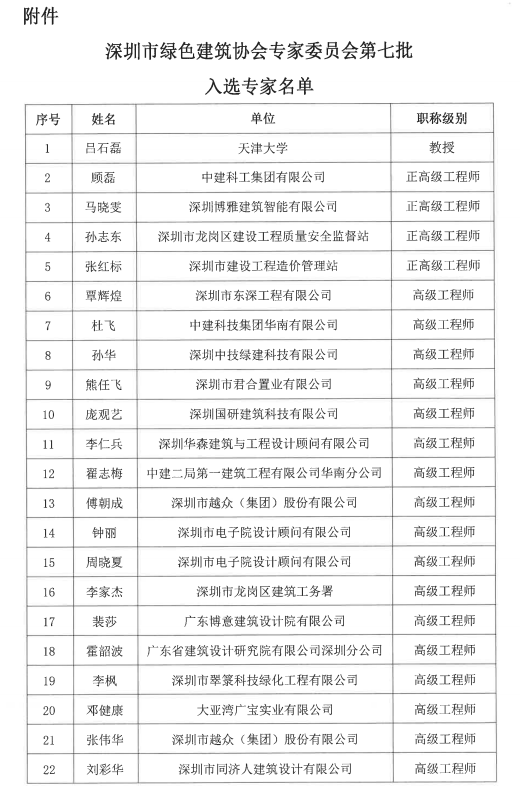 “深圳市綠色建筑協(xié)會專家委員會”第七批入選專家名單公告