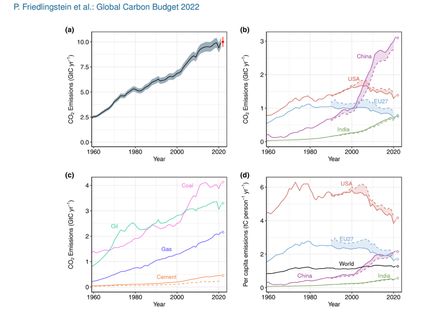近日,國(guó)際科學(xué)合作組織“全球碳計(jì)劃”(GCP)發(fā)布《2022年全球碳預(yù)算》報(bào)告(簡(jiǎn)稱(chēng)《報(bào)告》)。《報(bào)告》從化石能源碳排放、土地利用變化碳排放、陸地和海洋碳匯等方面預(yù)計(jì)了2022年全球碳排放總量及各國(guó)地區(qū)碳排放量,并提出將全球變暖限制在一定溫度下的碳預(yù)算。《報(bào)告》指出,預(yù)計(jì)2022年全球碳排放量為405億噸,90%來(lái)自化石能源,化石能源碳排放相較去年增加1%;如繼續(xù)保持當(dāng)前碳排放水平,全球升溫幅度有50%的概率將在9年內(nèi)突破1.5℃。