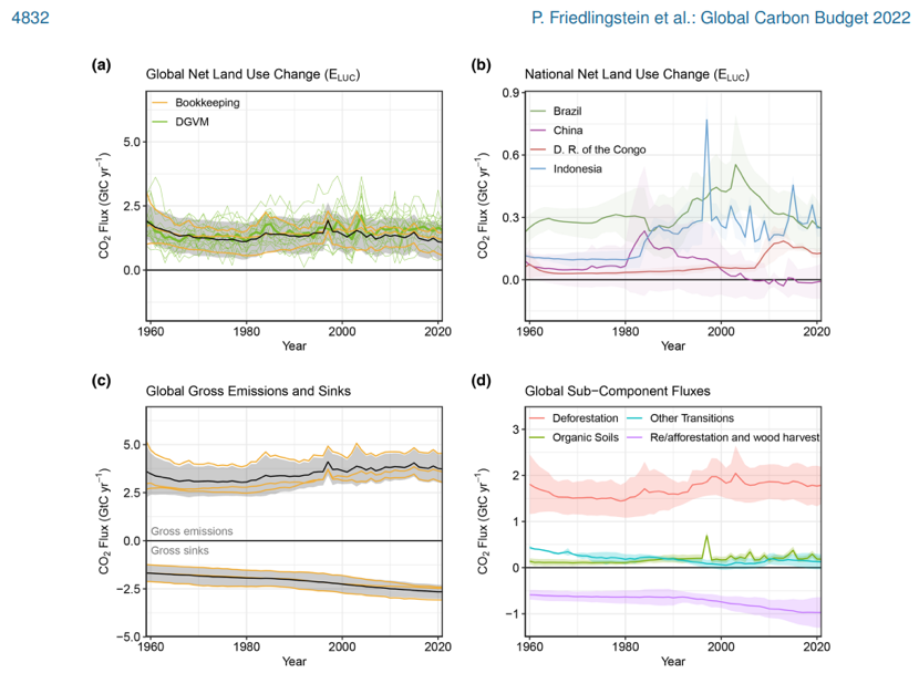 《報(bào)告》數(shù)據(jù)顯示,2022年,中國(guó)和歐盟化石能源碳排放預(yù)計(jì)將分別減少0.9、0.8%,美國(guó)、印度和其他國(guó)家地區(qū)均將增加;土地利用變化產(chǎn)生的碳排放預(yù)計(jì)變化較小,該領(lǐng)域碳排放占比較大的國(guó)家為印度尼西亞、巴西和剛果(占全球58%)。