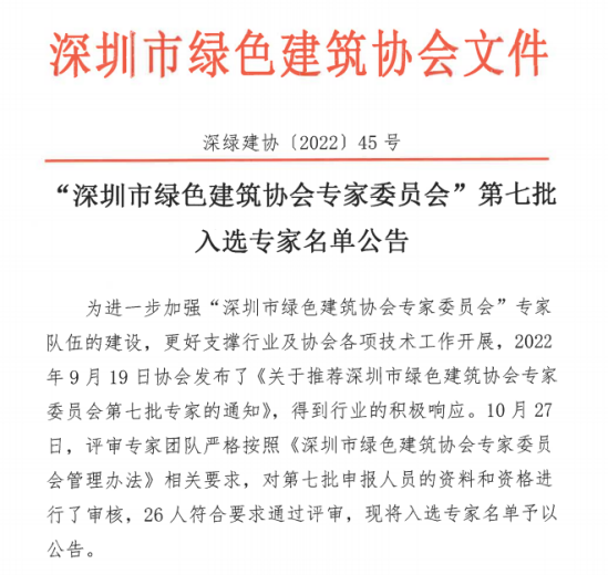 1、“深圳市綠色建筑協(xié)會專家委員會”第七批專家征集