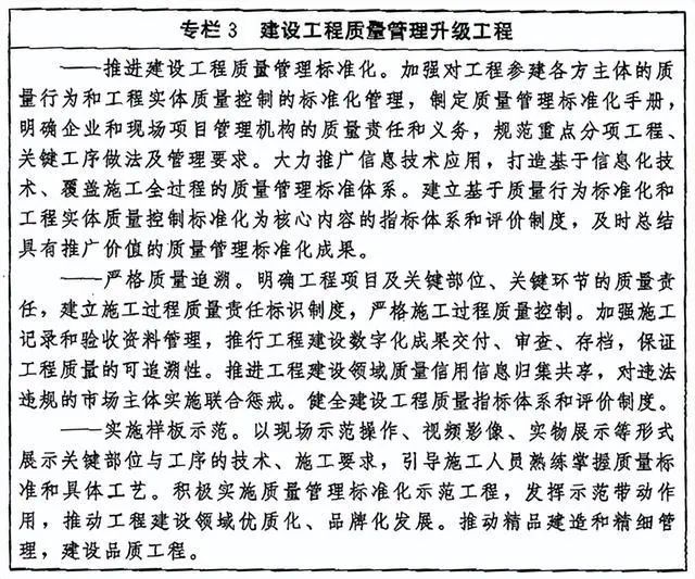 (十五)打造中國建造升級(jí)版。堅(jiān)持百年大計(jì)、質(zhì)量第一,樹立全生命周期建設(shè)發(fā)展理念,構(gòu)建現(xiàn)代工程建設(shè)質(zhì)量管理體系,打造中國建造品牌。完善勘察、設(shè)計(jì)、監(jiān)理、造價(jià)等工程咨詢服務(wù)技術(shù)標(biāo)準(zhǔn),鼓勵(lì)發(fā)展全過程工程咨詢和專業(yè)化服務(wù)。完善工程設(shè)計(jì)方案審查論證機(jī)制,突出地域特征、民族特點(diǎn)、時(shí)代風(fēng)貌,提供質(zhì)量優(yōu)良、安全耐久、環(huán)境協(xié)調(diào)、社會(huì)認(rèn)可的工程設(shè)計(jì)產(chǎn)品。加大先進(jìn)建造技術(shù)前瞻性研究力度和研發(fā)投入,加快建筑信息模型等數(shù)字化技術(shù)研發(fā)和集成應(yīng)用,創(chuàng)新開展工程建設(shè)工法研發(fā)、評(píng)審、推廣。加強(qiáng)先進(jìn)質(zhì)量管理模式和方法高水平應(yīng)用,打造品質(zhì)工程標(biāo)桿。推廣先進(jìn)建造設(shè)備和智能建造方式,提升建設(shè)工程的質(zhì)量和安全性能。大力發(fā)展綠色建筑,深入推進(jìn)可再生能源、資源建筑應(yīng)用,實(shí)現(xiàn)工程建設(shè)全過程低碳環(huán)保、節(jié)能減排。