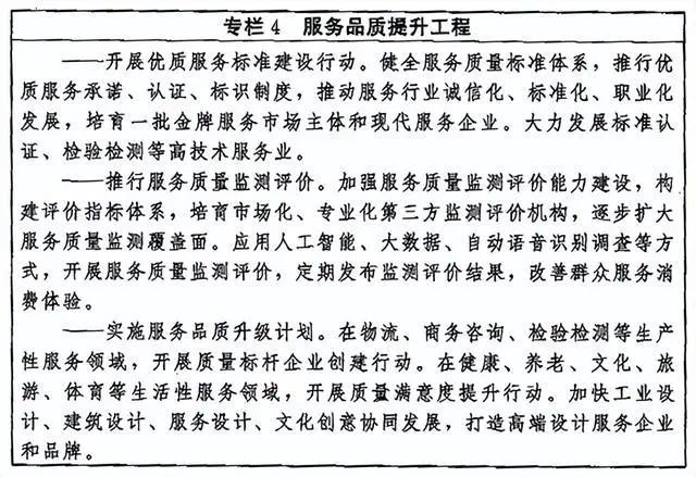 (七)提高產(chǎn)業(yè)質(zhì)量競爭水平。推動(dòng)產(chǎn)業(yè)質(zhì)量升級(jí),加強(qiáng)產(chǎn)業(yè)鏈全面質(zhì)量管理,著力提升關(guān)鍵環(huán)節(jié)、關(guān)鍵領(lǐng)域質(zhì)量管控水平。開展對(duì)標(biāo)達(dá)標(biāo)提升行動(dòng),以先進(jìn)標(biāo)準(zhǔn)助推傳統(tǒng)產(chǎn)業(yè)提質(zhì)增效和新興產(chǎn)業(yè)高起點(diǎn)發(fā)展。推進(jìn)農(nóng)業(yè)品種培優(yōu)、品質(zhì)提升、品牌打造和標(biāo)準(zhǔn)化生產(chǎn),全面提升農(nóng)業(yè)生產(chǎn)質(zhì)量效益。加快傳統(tǒng)制造業(yè)技術(shù)迭代和質(zhì)量升級(jí),強(qiáng)化戰(zhàn)略性新興產(chǎn)業(yè)技術(shù)、質(zhì)量、管理協(xié)同創(chuàng)新,培育壯大質(zhì)量競爭型產(chǎn)業(yè),推動(dòng)制造業(yè)高端化、智能化、綠色化發(fā)展,大力發(fā)展服務(wù)型制造。加快培育服務(wù)業(yè)新業(yè)態(tài)新模式,以質(zhì)量創(chuàng)新促進(jìn)服務(wù)場(chǎng)景再造、業(yè)務(wù)再造、管理再造,推動(dòng)生產(chǎn)性服務(wù)業(yè)向?qū)I(yè)化和價(jià)值鏈高端延伸,推動(dòng)生活性服務(wù)業(yè)向高品質(zhì)和多樣化升級(jí)。完善服務(wù)業(yè)質(zhì)量標(biāo)準(zhǔn),加強(qiáng)服務(wù)業(yè)質(zhì)量監(jiān)測(cè),優(yōu)化服務(wù)業(yè)市場(chǎng)環(huán)境。加快大數(shù)據(jù)、網(wǎng)絡(luò)、人工智能等新技術(shù)的深度應(yīng)用,促進(jìn)現(xiàn)代服務(wù)業(yè)與先進(jìn)制造業(yè)、現(xiàn)代農(nóng)業(yè)融合發(fā)展。