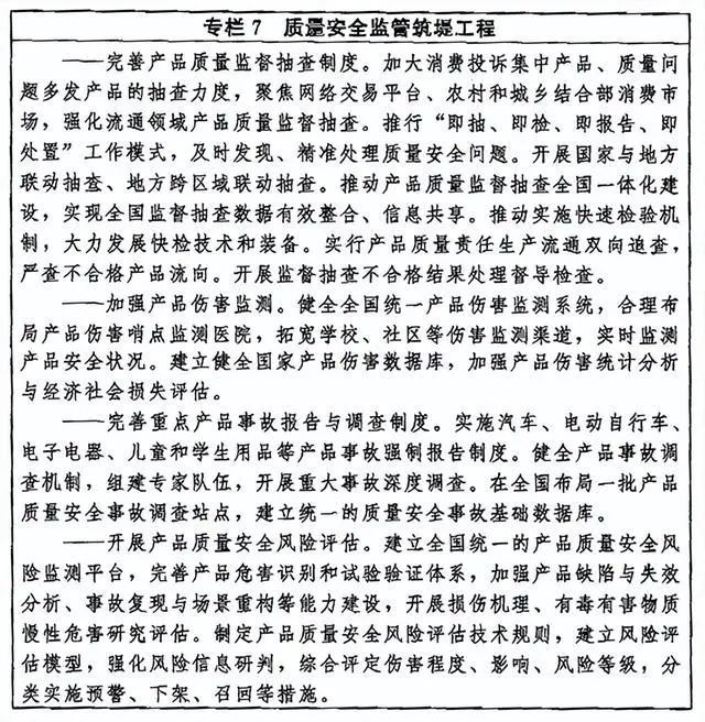 (二十七)優(yōu)化質(zhì)量監(jiān)管效能。健全以“雙隨機(jī)、一公開”監(jiān)管和“互聯(lián)網(wǎng)+監(jiān)管”為基本手段、以重點(diǎn)監(jiān)管為補(bǔ)充、以信用監(jiān)管為基礎(chǔ)的新型監(jiān)管機(jī)制。創(chuàng)新質(zhì)量監(jiān)管方式,完善市場(chǎng)準(zhǔn)入制度,深化工業(yè)產(chǎn)品生產(chǎn)許可證和強(qiáng)制性認(rèn)證制度改革,分類放寬一般工業(yè)產(chǎn)品和服務(wù)業(yè)準(zhǔn)入限制,強(qiáng)化事前事中事后全鏈條監(jiān)管。對(duì)涉及人民群眾身體健康和生命財(cái)產(chǎn)安全、公共安全、生態(tài)環(huán)境安全的產(chǎn)品以及重點(diǎn)服務(wù)領(lǐng)域,依法實(shí)施嚴(yán)格監(jiān)管。完善產(chǎn)品質(zhì)量監(jiān)督抽查制度,加強(qiáng)工業(yè)品和消費(fèi)品質(zhì)量監(jiān)督檢查,推動(dòng)實(shí)現(xiàn)生產(chǎn)流通、線上線下一體化抽查,探索建立全國聯(lián)動(dòng)抽查機(jī)制,對(duì)重點(diǎn)產(chǎn)品實(shí)施全國企業(yè)抽查全覆蓋,強(qiáng)化監(jiān)督抽查結(jié)果處理。建立健全產(chǎn)品質(zhì)量安全風(fēng)險(xiǎn)監(jiān)控機(jī)制,完善產(chǎn)品傷害監(jiān)測(cè)體系,開展質(zhì)量安全風(fēng)險(xiǎn)識(shí)別、評(píng)估和處置。建立健全產(chǎn)品質(zhì)量安全事故強(qiáng)制報(bào)告制度,開展重大質(zhì)量安全事故調(diào)查與處理。健全產(chǎn)品召回管理體制機(jī)制,加強(qiáng)召回技術(shù)支撐,強(qiáng)化缺陷產(chǎn)品召回管理。構(gòu)建重點(diǎn)產(chǎn)品質(zhì)量安全追溯體系,完善質(zhì)量安全追溯標(biāo)準(zhǔn),加強(qiáng)數(shù)據(jù)開放共享,形成來源可查、去向可追、責(zé)任可究的質(zhì)量安全追溯鏈條。加強(qiáng)產(chǎn)品防偽監(jiān)督管理。建立質(zhì)量安全“沙盒監(jiān)管”制度,為新產(chǎn)品新業(yè)態(tài)發(fā)展提供容錯(cuò)糾錯(cuò)空間。加強(qiáng)市場(chǎng)秩序綜合治理,營造公平競爭的市場(chǎng)環(huán)境,促進(jìn)質(zhì)量競爭、優(yōu)勝劣汰。嚴(yán)格進(jìn)出口商品質(zhì)量安全檢驗(yàn)監(jiān)管,持續(xù)完善進(jìn)出口商品質(zhì)量安全風(fēng)險(xiǎn)預(yù)警和快速反應(yīng)監(jiān)管機(jī)制。加大對(duì)城鄉(xiāng)結(jié)合部、農(nóng)村等重點(diǎn)區(qū)域假冒偽劣的打擊力度。強(qiáng)化網(wǎng)絡(luò)平臺(tái)銷售商品質(zhì)量監(jiān)管,健全跨地區(qū)跨行業(yè)監(jiān)管協(xié)調(diào)聯(lián)動(dòng)機(jī)制,推進(jìn)線上線下一體化監(jiān)管。