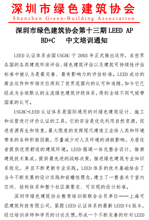 深圳市綠色建筑協(xié)會第十三期LEED AP?BD+C ?中文培訓通知