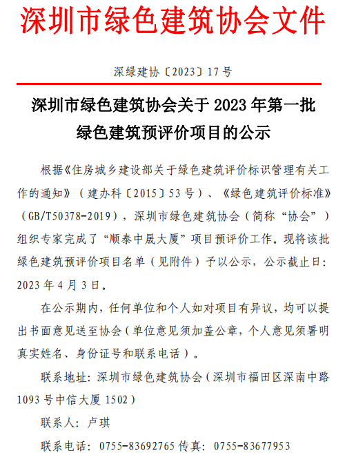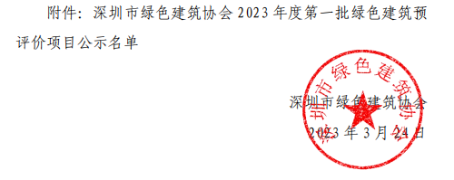 深圳市綠色建筑協(xié)會(huì)關(guān)于2023年第一批綠色建筑預(yù)評(píng)價(jià)項(xiàng)目的公示