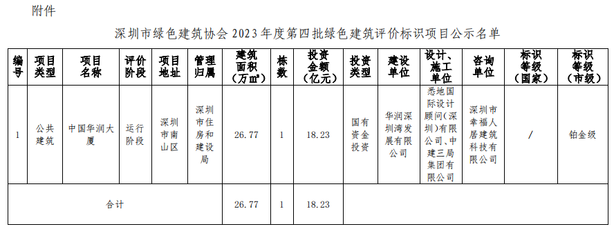 深圳市綠色建筑協(xié)會(huì)關(guān)于2023年第四批綠色建筑評(píng)價(jià)標(biāo)識(shí)項(xiàng)目的公示