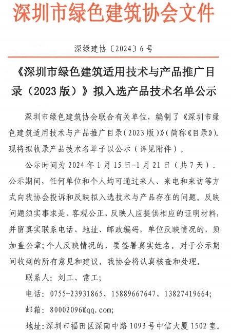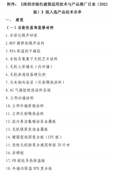 《深圳市綠色建筑適用技術(shù)與產(chǎn)品推廣目錄(2023版)》擬入選產(chǎn)品技術(shù)名單公示