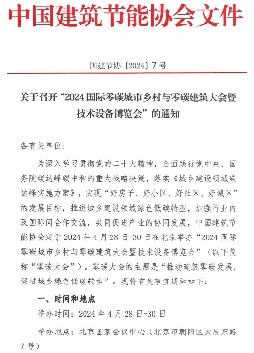 近日,中國建筑節(jié)能協會發(fā)布《關于召開“2024國際零碳城市鄉(xiāng)村與零碳大會暨技術設備博覽會”的通知》(簡稱《通知》)。《通知》指出,2024國際零碳城市鄉(xiāng)村與零碳大會暨技術設備博覽會定于2024年4月28-30日在北京召開,主題為“推動建筑零碳發(fā)展,促進城鄉(xiāng)綠色低碳轉型”。
