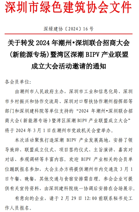 關(guān)于轉(zhuǎn)發(fā)2024年潮州?深圳聯(lián)合招商大會(新能源專場)暨灣區(qū)深潮BIPV產(chǎn)業(yè)聯(lián)盟成立大會活動邀請的通知