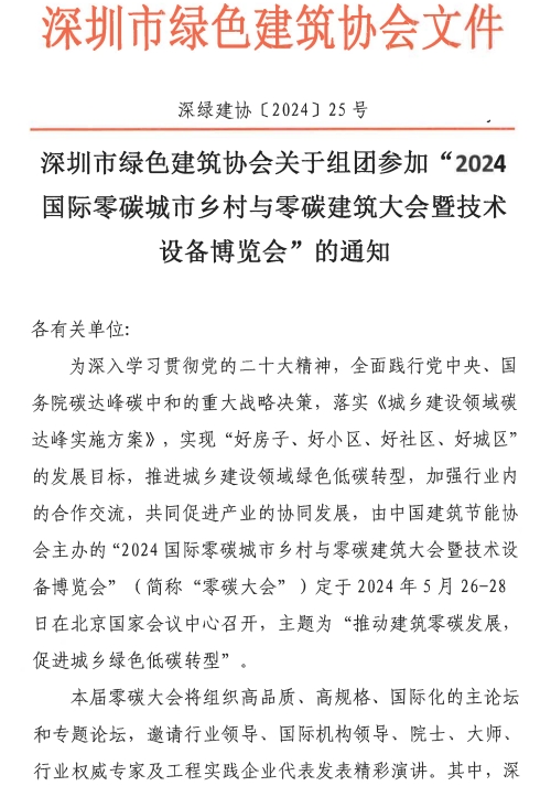 深圳市綠色建筑協(xié)會(huì)關(guān)于組團(tuán)參加“2024國際零碳城市鄉(xiāng)村與零碳建筑大會(huì)暨技術(shù)設(shè)備博覽會(huì)”的通知