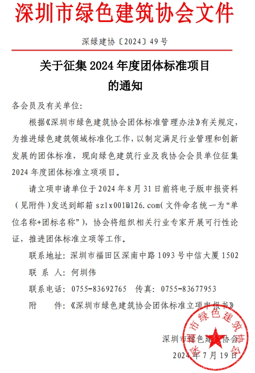 深圳市綠色建筑協(xié)會(huì)關(guān)于征集2024年度團(tuán)體標(biāo)準(zhǔn)項(xiàng)目的通知