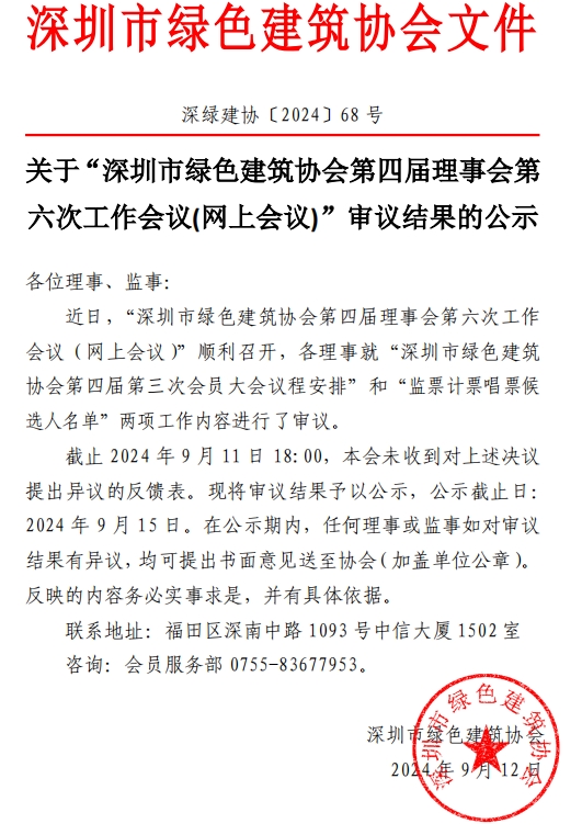 關(guān)于“深圳市綠色建筑協(xié)會(huì)第四屆理事會(huì)第六次工作會(huì)議”審議結(jié)果的公示
