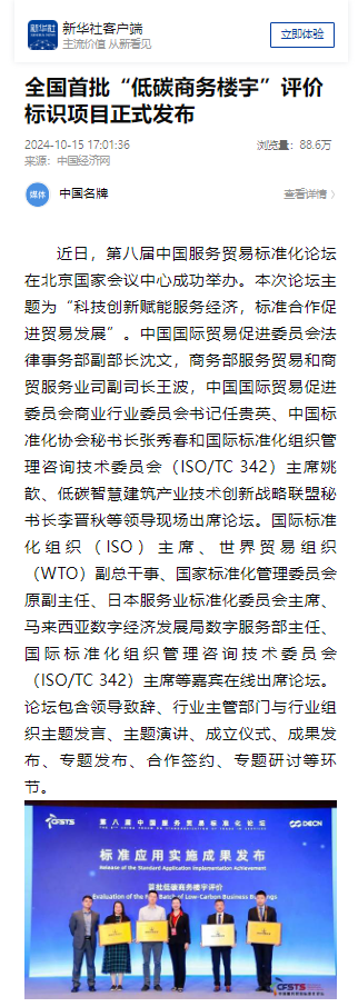 近期,全國首批“低碳商務樓宇”評價標識項目正式發(fā)布,獲得中國經(jīng)濟網(wǎng)、新華社等兩家國家權威媒體的關注和報道。