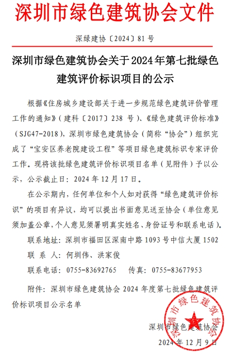 深圳市綠色建筑協(xié)會關(guān)于2024年第七批綠色建筑評價標(biāo)識項(xiàng)目的公示