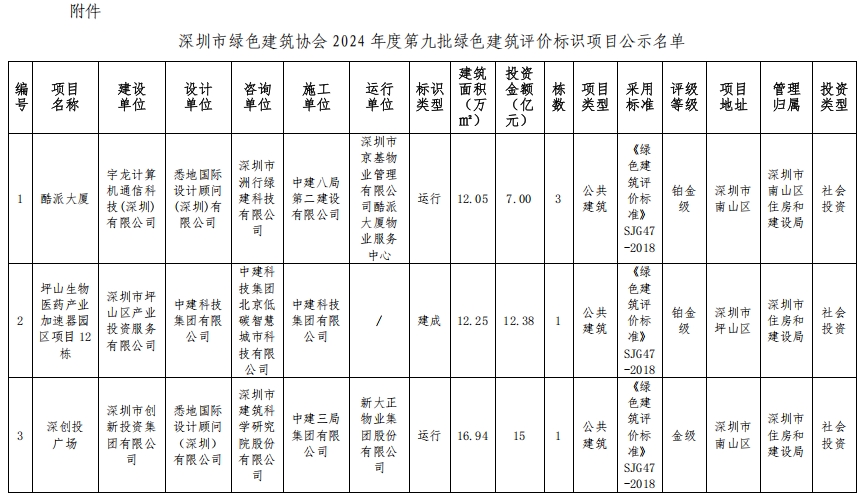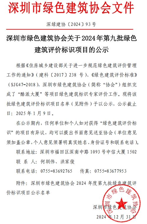 深圳市綠色建筑協(xié)會(huì)關(guān)于2024年第九批綠色建筑評(píng)價(jià)標(biāo)識(shí)項(xiàng)目的公示