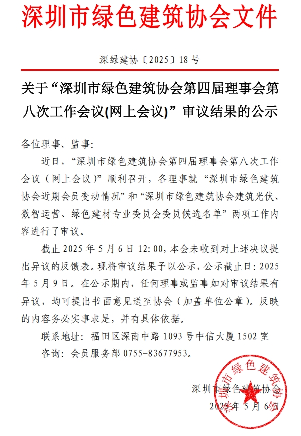 關(guān)于“深圳市綠色建筑協(xié)會(huì)第四屆理事會(huì)第八次工作會(huì)議”審議結(jié)果的公示