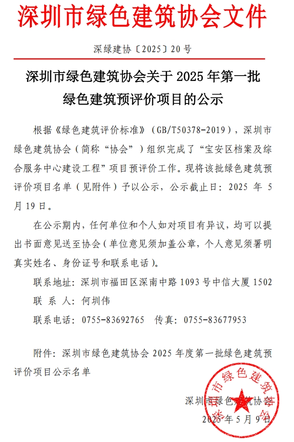 深圳市綠色建筑協(xié)會關于2025年第一批綠色建筑預評價項目的公示