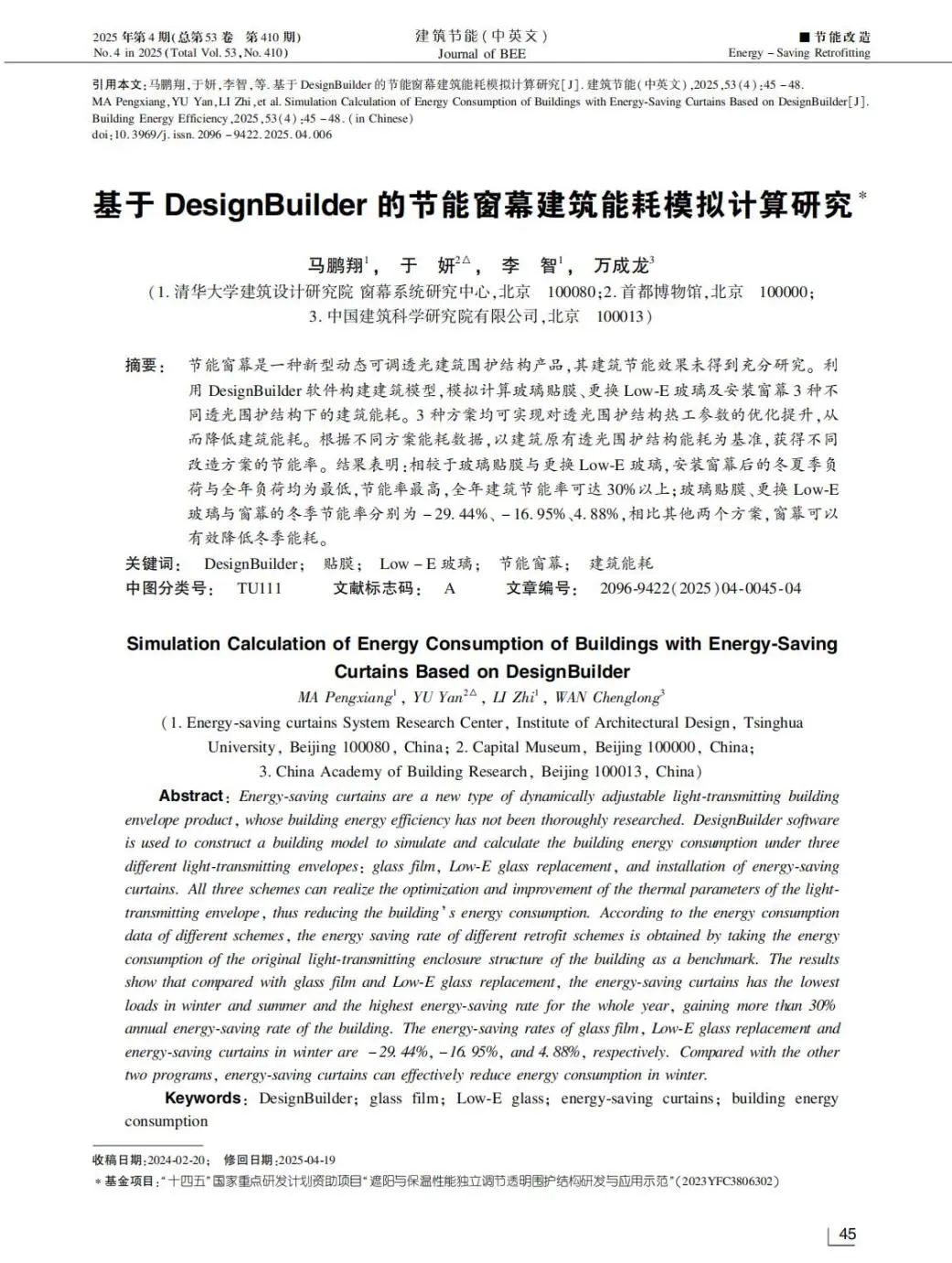 《建筑節(jié)能(中英文)》雜志作為中國建筑東北設(shè)計(jì)研究院主管的中國科技核心期刊,先后入選國家新聞出版廣電總局認(rèn)定的第一批學(xué)術(shù)期刊、建筑科學(xué)領(lǐng)域高質(zhì)量科技期刊分級(jí)目錄期刊(T3)、中國學(xué)術(shù)期刊影響因子年報(bào)統(tǒng)計(jì)源期刊、RCCSE中國核心學(xué)術(shù)期刊,是建筑領(lǐng)域科研成果發(fā)布與學(xué)術(shù)交流的重要平臺(tái)。此次論文的刊發(fā),標(biāo)志著單向可視節(jié)能窗幕在透光圍護(hù)結(jié)構(gòu)節(jié)能改造中的應(yīng)用價(jià)值獲得學(xué)術(shù)界高度認(rèn)可。