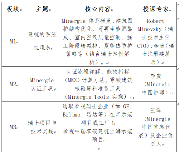 1、權(quán)威師資:由瑞士 Minergie 技術(shù)團(tuán)隊(duì)與中瑞零碳建筑項(xiàng)目專家聯(lián)合授課,確保內(nèi)容的專業(yè)性與國(guó)際前沿性。