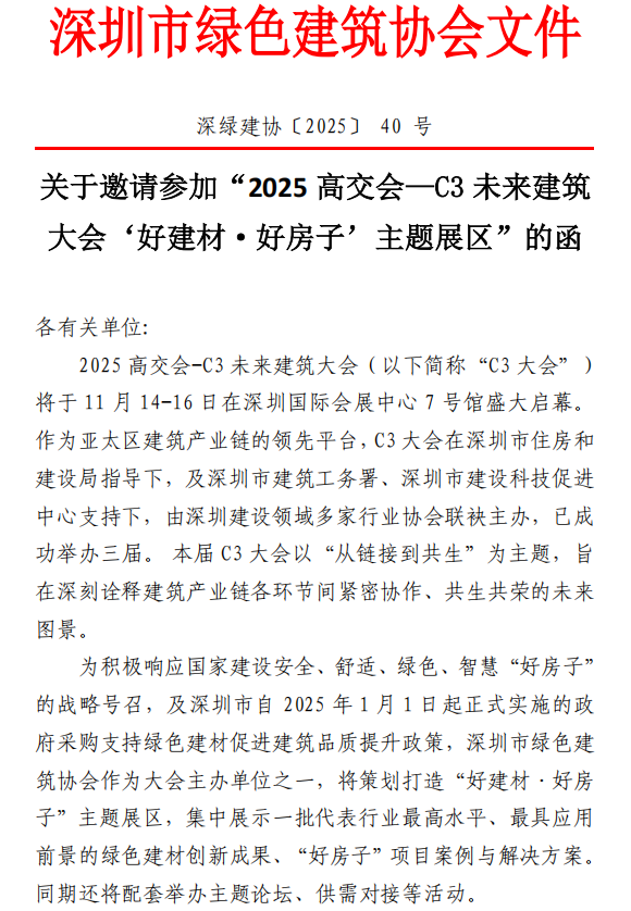 深圳市綠色建筑協(xié)會(huì)關(guān)于邀請(qǐng)參加“2025高交會(huì)—C3未來(lái)建筑大會(huì)‘好建材·好房子’主題展區(qū)”的函