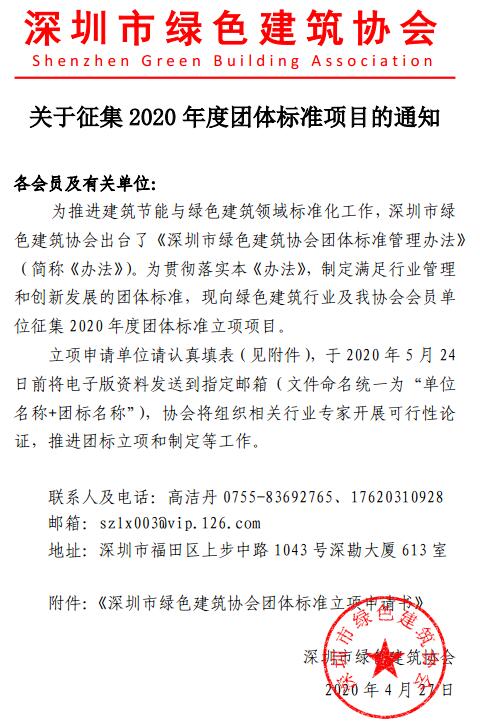 深圳市綠色建筑協(xié)會(huì)關(guān)于征集 2020 年度團(tuán)體標(biāo)準(zhǔn)項(xiàng)目的通知
